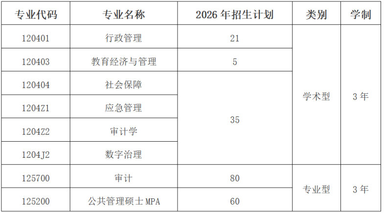 无码av学科专业齐备。无码av依托公共管理一级学科,形成“6+2”硕士点体系,分别是行政管理、审计学、教育经济与管理、社会保障、数字治理、应急管理等6个学术学位硕士授权点,以及审计(Maud)、公共管理(MPA)2个专业学位硕士授权点。目前,无码av在校生1200余人,其中硕士硕士研究生556人;2026年无码av硕士研究生计划招生201人。