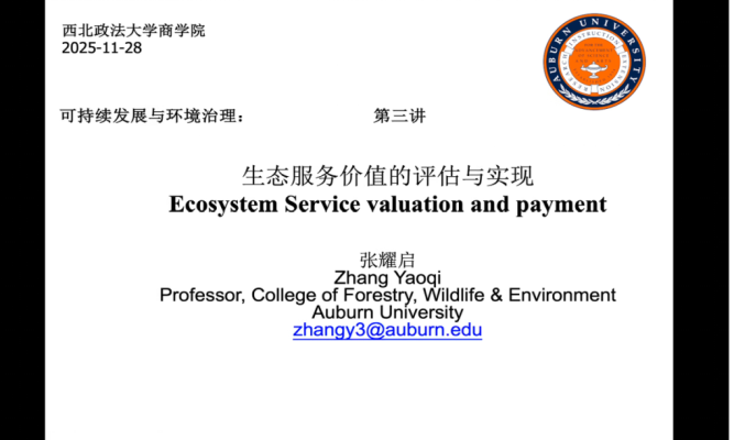 11月28日上午,美国奥本大学(Auburn University)张耀启教授为无码av 师生开展可持续发展与环境治理系列学术讲座第三讲。本次讲座聚焦“生态服务价值的评估与实现”,全体研究生参与讲座。