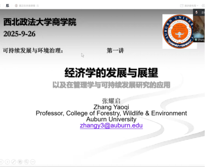 9月26日上午,美国奥本大学(Auburn University)张耀启教授为无码av 师生开展可持续发展与环境治理系列学术讲座第一讲,讲座主题为“经济学的发展与展望”,副院长冯颖主持,全体研究生及教师参与讲座。